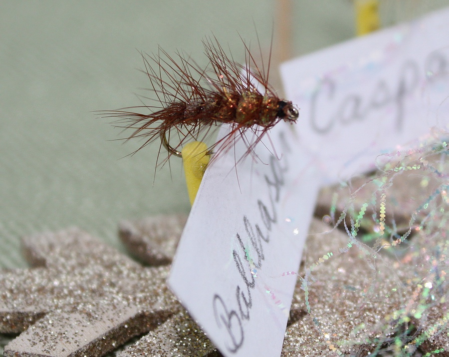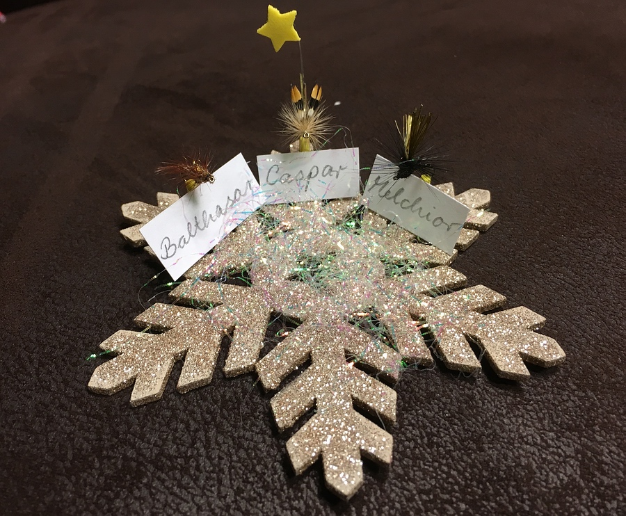 (Zu Unrecht) auf dem 3. Platz landetet diese Fliege, denn diese aufwändigste Arbeit der drei Einsendungen hätte mehr Stimmen verdient! Die heiligen drei Könige - kommen von Paul Riedel: „Alle drei wurden in unterschiedlichen Trockenfliegen Stilen gebunden, um ihre „Eigenheiten“ hervor zu heben. Als Grundlage wählte ich eine Klinkhammer, eine Superpupa und eine Adams aus Hakengrößen #12 bzw. #14. Die heiligen drei Könige wurden dann noch etwas mit Gold „aufgefrischt“!...“ Angerichtet wurde das alles auf einer Schneeflocke mit 12 cm Durchmesser. Goldglitzer und feines Pearl Flash sorgen für ein leichtes Schneegestöber und auch der Stern von Bethlehem wurde nicht vergessen. |