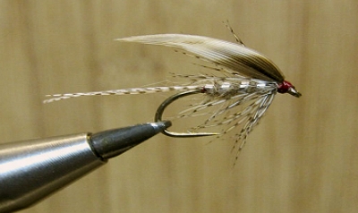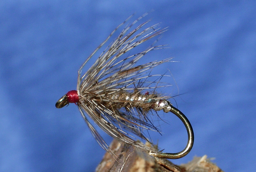 Haken: Nassfliegenhaken Größe 10 Faden: Uni 8/0 Fire-Orange Schwanz: Fasanenhenne Schwanzfeder ca. 6 Fibern Rippung: Feiner Silberdraht Körper. Flaches Silbertinsel Thorax: Unterwolle Wildschwein (sehr spärlich) Kopfhechel: Henne Braun Flügel: Bussard, alternativ Truthahn oder Pfau |