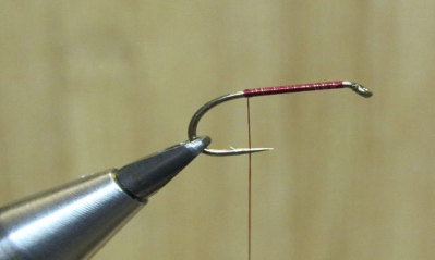 | Alles überwickeln und Faden nach hinten führen, wachsen, Dubbing anspinnen und einen dünnen, leicht konischen Körper formen. Rippen, abschließen, Tinsel abschneiden. |