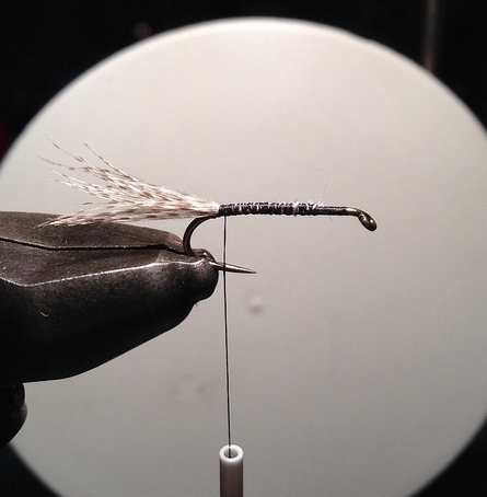 | Die Partridge-Hechel vom Flaum befreien, von der Spitze her die Fiebern zum Kiel streifen und mit der Spitze einbinden. Überschüssiges abschneiden. Die Hechel falten und mit ca. 1,5 – 2 Windungen (dabei die Fiebern immer nach hinten streifen) um den Haken legen. Überfangen, abschneiden und ein Köpfchen formen. Whip finish. |