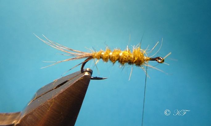 Haken: Gamakatsu F31 #10 Faden: Uni-Thread Tan 8/0 oder wie hier Olive Dun 8/0 Bleiwicklung: Rundblei 0,020 Schwänzchen: Einige Fibern einer braunen Rebhuhnfeder Rippung: Pearl Tinsel oder Flashabou Körper: Hasendubbing Hare`s ear plus Farbe golden oder ähnlich Hechel: Rebhuhnfeder braun |