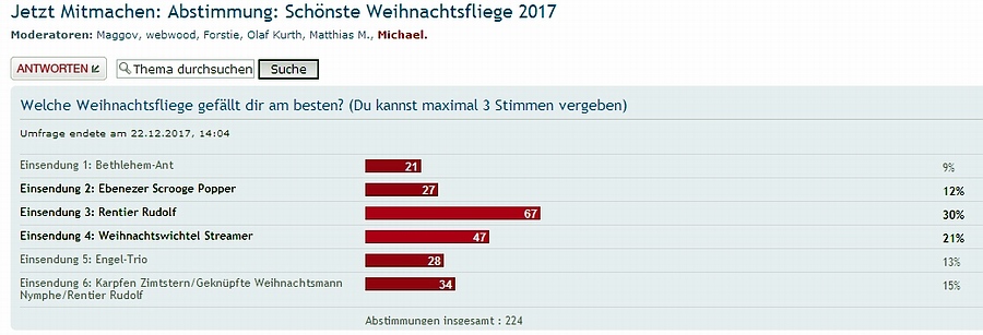 Weiterführende Links zum Thema: - die Ausschreibung & Ausstellung: (im Board / hier Klicken) - die Abstimmung: (im Board / hier Klicken) - und hier sind die Weihnachtsfliegenberichte der letzten Jahre: - 2016: (hier Klicken) - 2015: (hier Klicken) - 2014: (hier Klicken) - 2013: (hier Klicken) - 2012: (hier Klicken) - 2011: (hier Klicken) - 2010: (hier Klicken) - 2009: (hier Klicken) |