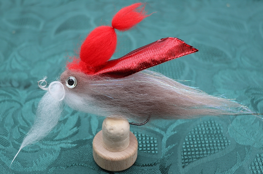 Gesamtlänge dieses Werkes: 6,5 cm. Verarbeitet wurden auf einem Streamerhaken u.a. Foam für Körper und Panzer, Federsegmente für Scheren und Schwanz, Pfeifenreiniger für die 8 Beinchen, Borstenmaterial für Fühler, etwas Dubbing (oder Chenille) und ein kleiner Santa-Kopf. |