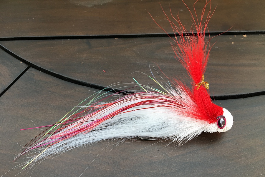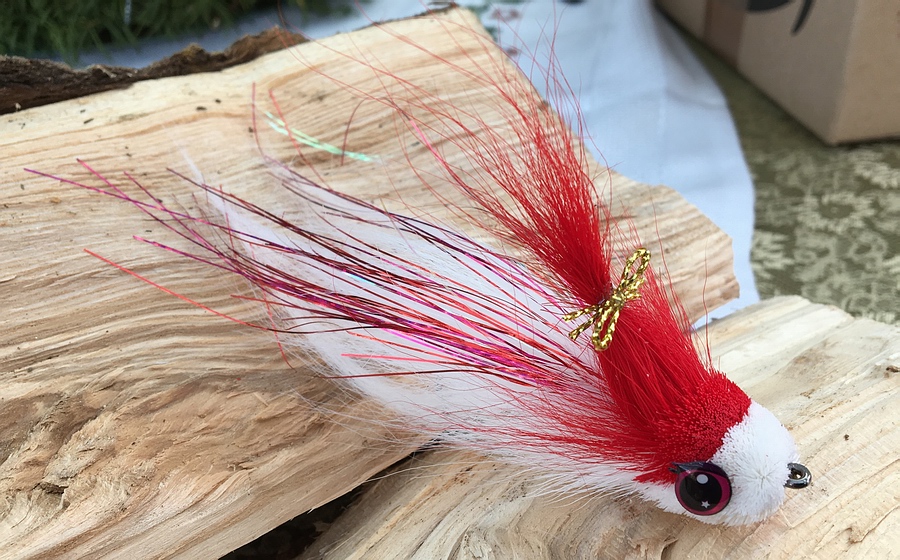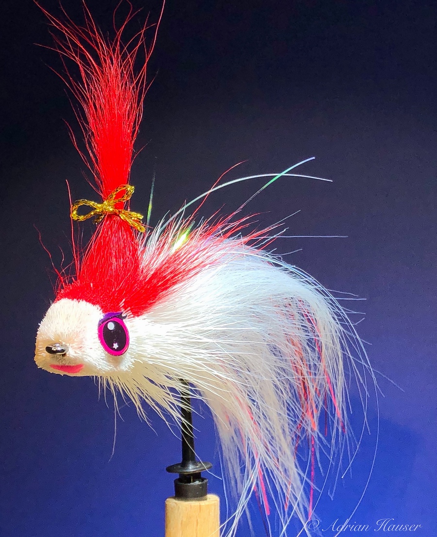 Material: Dear Brush Hair (weiß und rot), Fur-Fiber, Flash in rot und pink, Lippen UV-Kleber in pink, Klebeaugen mit Epoxy befestigt, gebunden auf einen Tunca 8/0. Gesamtlänge dieses Werkes: rd. 17 cm. |