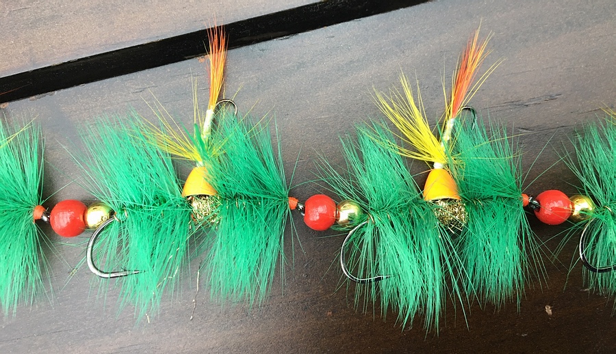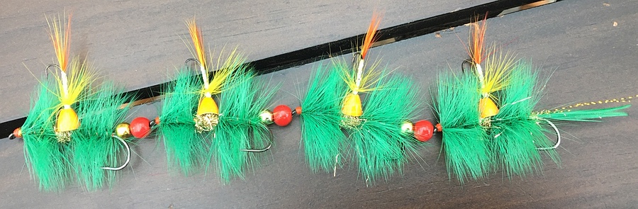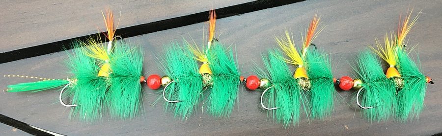 articulated Adventskranz von Dirk / Bachneunauge Er schreibt dazu: "Er hat einige zusätzliche Anbissstellen, teilweise in Reizfarbe und durch die zusätzliche Beschwerung einen verführerischen Jig-Effekt." Materialliste: 4 Streamerhaken Größe 4, 4 Nymphenhaken Größe 12, 4 Coneheads, Sealsfur Grün, Sattelhecheln grün, Goldtinsel, Crystal Flash Gold, rote und goldene Perlen, Hechelfibern rot, orange und gelb, Seidenfloss weiß, Monofil, Golddraht, Lite Brite gold, Faden rot. Gesamtlänge dieses Werkes: rd. 19 cm, oder als Kranz: Durchmesser 8 cm. |