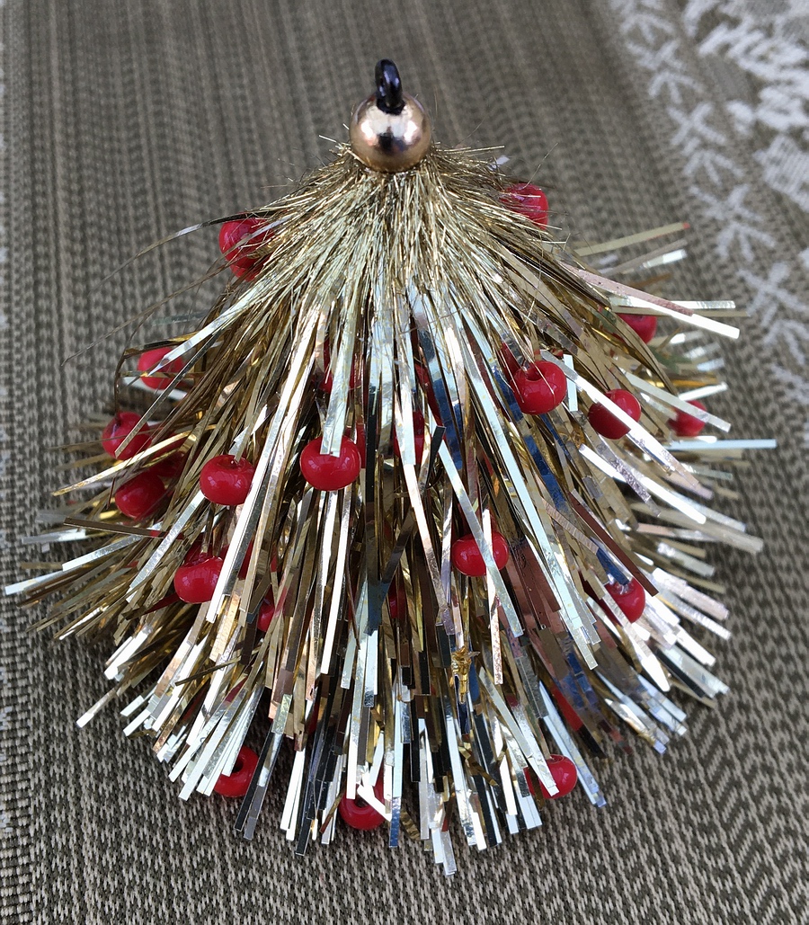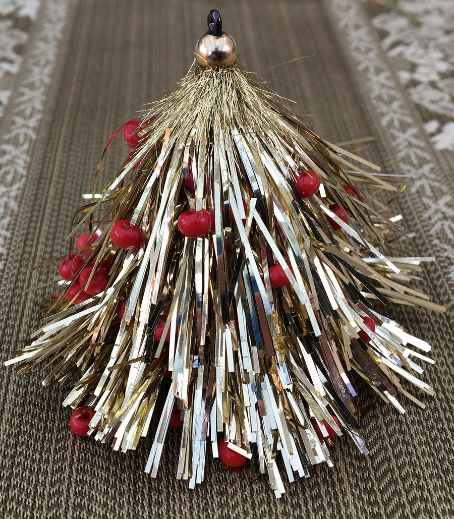 Goldene Weihnachtsbaum von Klaus / Forellenklaus Material und Verarbeitung: "Haken 3/0, Länge 50 mm, Brass Bend Gold 6,0 mm, rote Kunststoffperlen 4,2 mm, mit UV-Kleber eingeklebt. Lametta, kleingeschnitten und in einer Schlaufe eingebunden. Haken mit konischer Grundwicklung. Fuß: Metallklammer. Moosgummi, schwarz." Höhe dieses hübschen Weihnachtsbaumes: 6 cm |