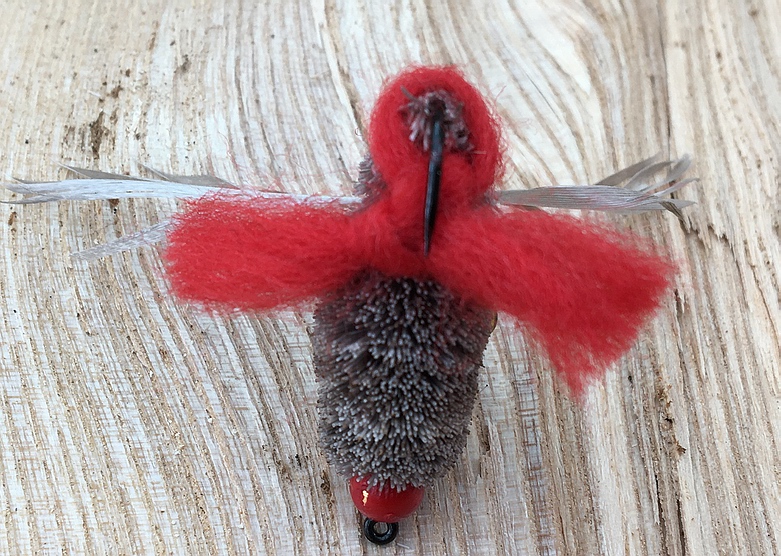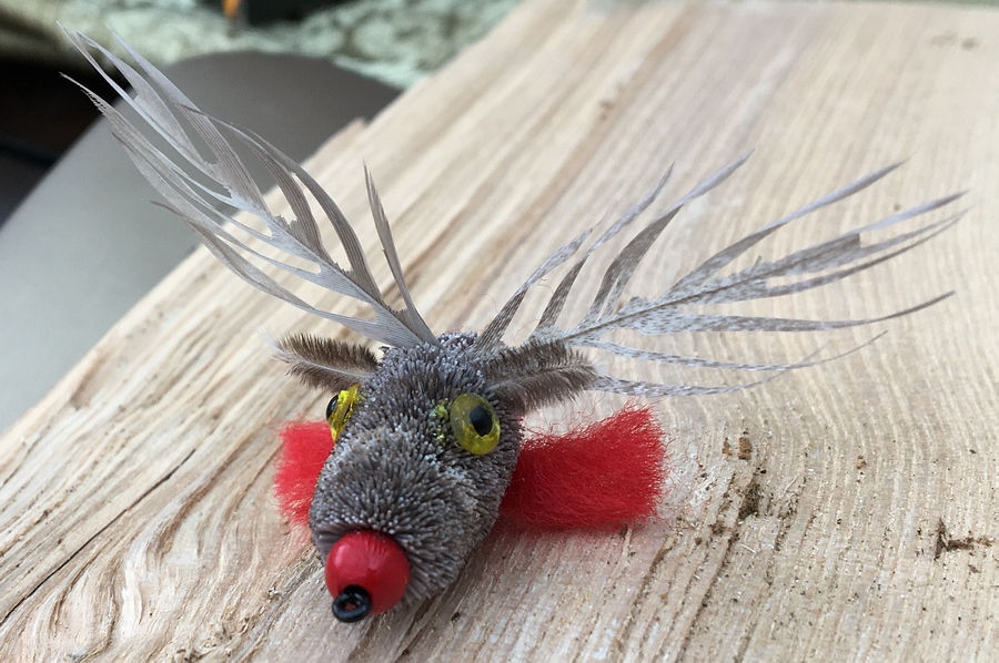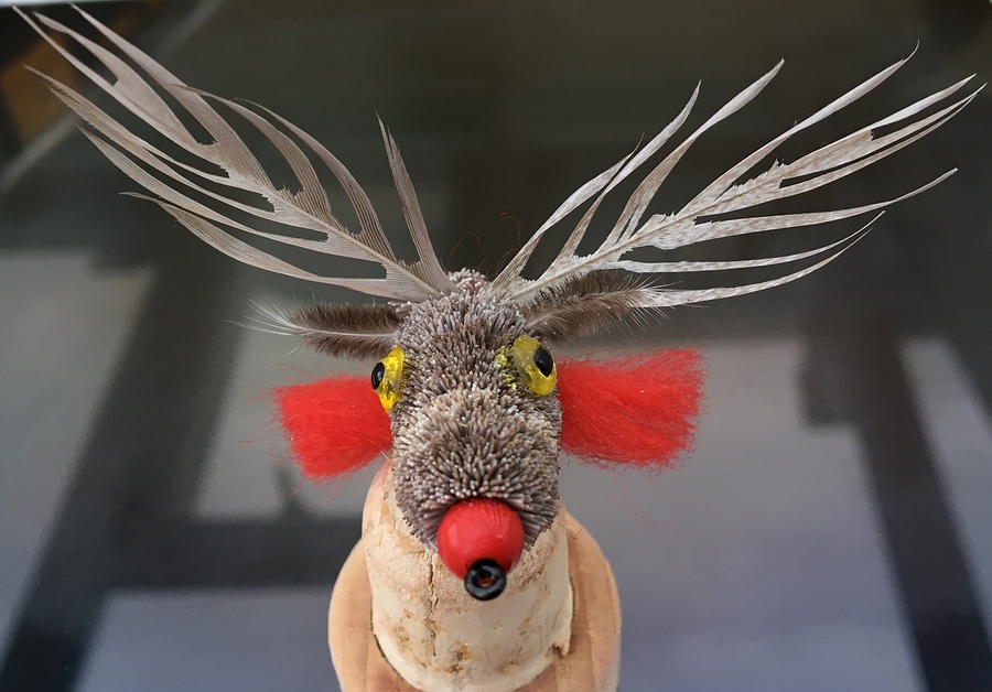 Rudolph, the Red-Nosed Reindeer - von Chris OPF Materialliste: Streamerhaken mit großem Bogen, Goldperle, rot lackiert, Rehhaar, Augen (aus UV-Lack selbst gemacht), Entenfedern, rote Wolle für den Schal, Ohren aus Diamantfasan. Er schreibt dazu: "...zwar kein fischbares Muster - aber etwas was der ganzen Familie gefällt. Als Motivation lief das Lied beim Binden.....ununterbrochen! Hohoho, euer Chris" Größe: 6 x 4 x 4 cm Herzlichen