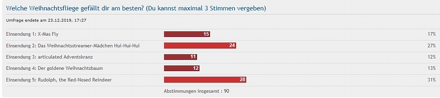 | An Alle: die Fliegenbinder und die Abstimmer: herzlichen Dank fürs Mitmachen und bis zum nächsten Mal! |