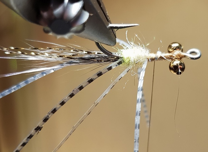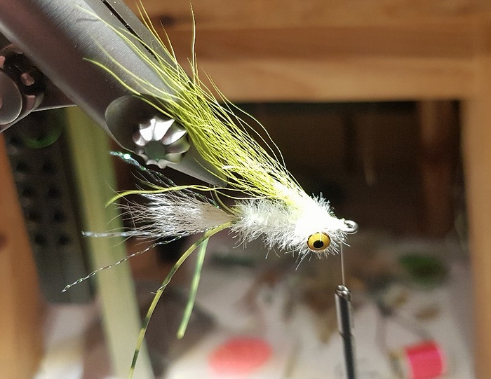 UTC 140 TMC 811S #4 Dumbbell Eyes 4mm "Schwänzchen" - Kalbsschwanz weiß und 4 Stränge Krystalflash pearl Körper - Ice Chenille weiß Beine - Sili Legs Chartreuse/Black Barred (The Fly CO.) Schwinge - Bucktail chartreuse Bindeschritte: 1. Dumbbell Eyes |