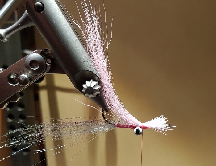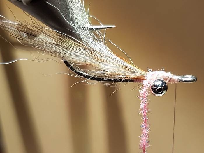 UTC 140 Pink TMC 811S #4 Dumbbell Eyes 4mm "Schwänzchen" - Hends Spectra Dubbing Pearl Beine - Hareline Loco Legs Bonefish Pink Hinterkörper - Icechenille 6mm Pink Vorderkörper - Flat Diamond Braid Schwinge - Dachs Bindeschritte: 1. Dumbbell Eyes 2. Schwänzchen |