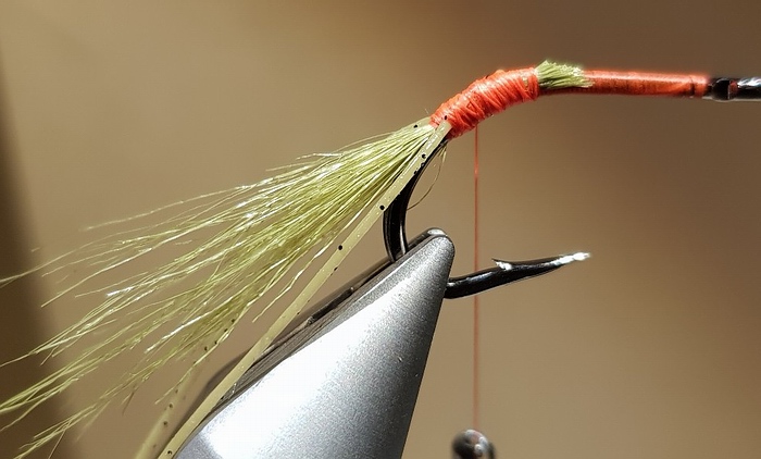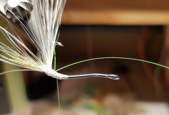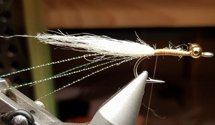 Nano Silk 12/0 Ahrex SA250 0,20mm Mono UV Kleber thin Kettenaugen Shrimp Eyes Speyhecheln SLF Saltwaterdubbing Mallard Pro Sportfisher Saltwater Angelhair EP Fiber Bindeschritte: 1. Mallard |
