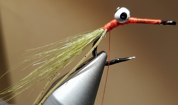 TMC 811S #2 Dumbbell Eyes 4mm UV Kleber thin Hardmono 20lb Messingperlen 3mm Eggyarn fluo orange Sililegs orange barred Krystalflash schwarz Flat Diamond Braid Perl SLF Saltwaterdubbing tan Zonker tan Bindeanleitung: 1. Dumbbell Eyes einbinden |