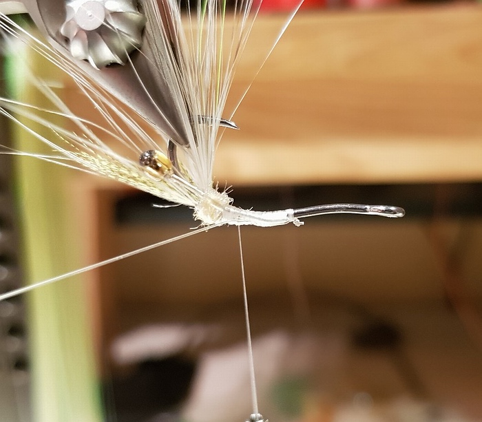 UTC 140 TMC 811S Kettenaugen 20lb Hardmono Bindelack MC Flyfoam Sililegs Easy Shrimp Eyes EP Fiber Bindeschritte: 1. Kettenaugen |