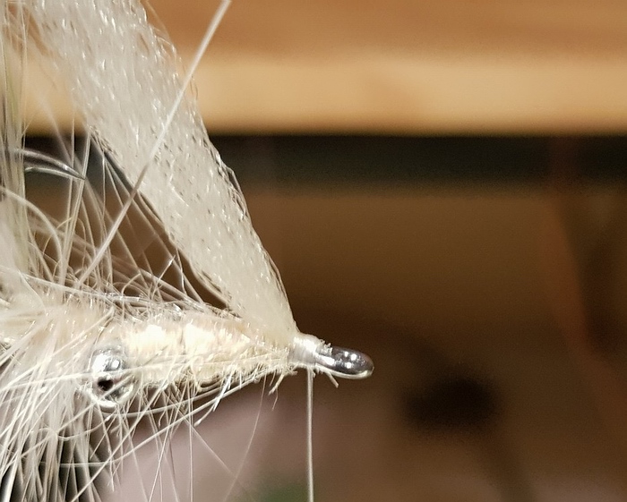 Die fertige Fliege mit UV Kleber im Kopfbereich sichern. |