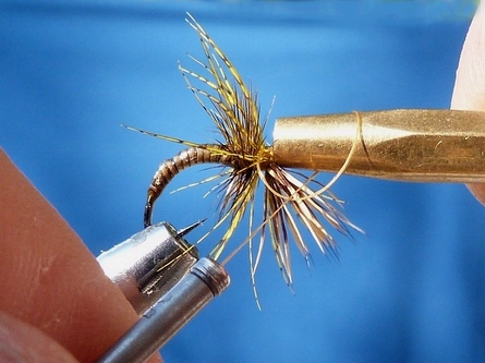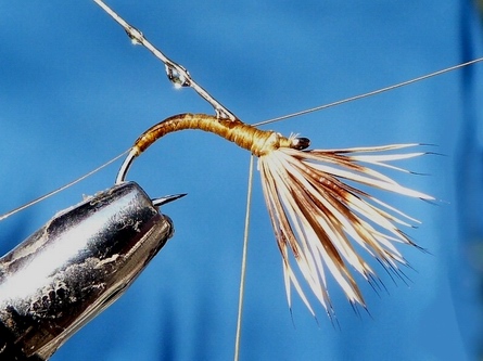 9. Den Quill auf dem Haken einbinden (ich bevorzuge es, ihn mit der Spitze nach vorne einzubinden damit die Rippung zum Thorax hin breiter und damit natürlicher wird) |