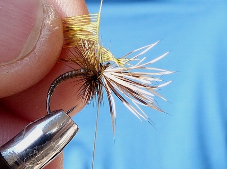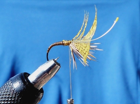 Dann den Rest der Feder nach hinten schlagen und mit 2 Wicklungen auf der Feder sichern. Dort auch die Fliege mit dem Kopfknoten abschließen. |