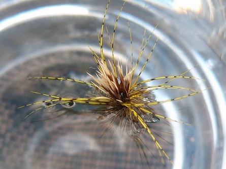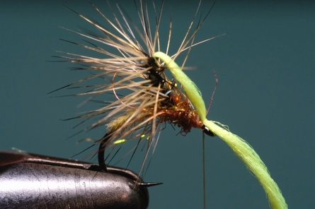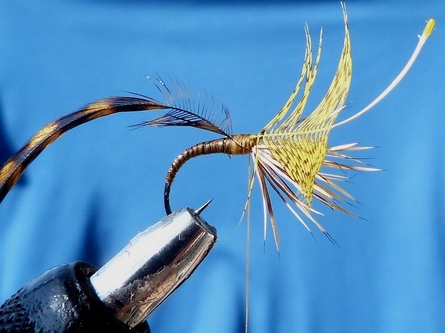 Haken: Tiemco 212Y GR 15 Bindfaden: Sheer 14/0 Gelb Floss: Gelb Körper: Biot von der Schwanenfeder von der Schwinge (selbst gefärbt) Thorax. Dubbing Peacock (Cinnamon) Hechel: Golden Badger Bindeanleitung: |
