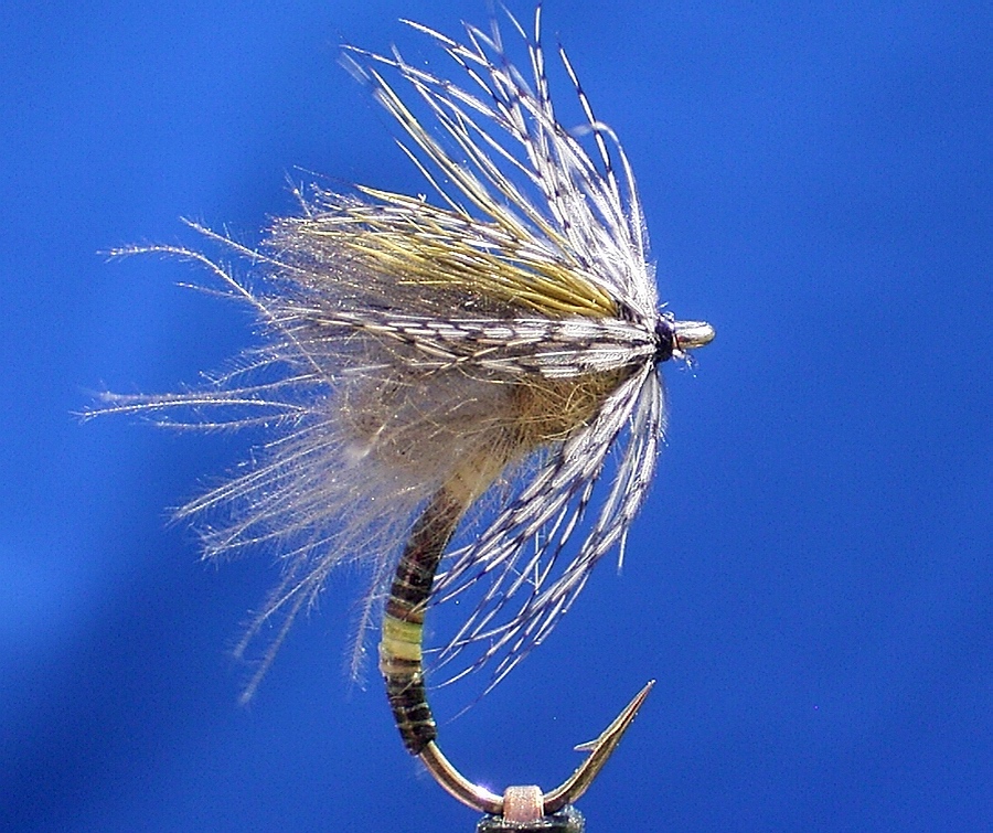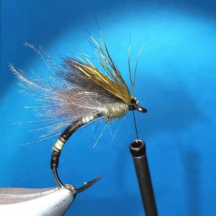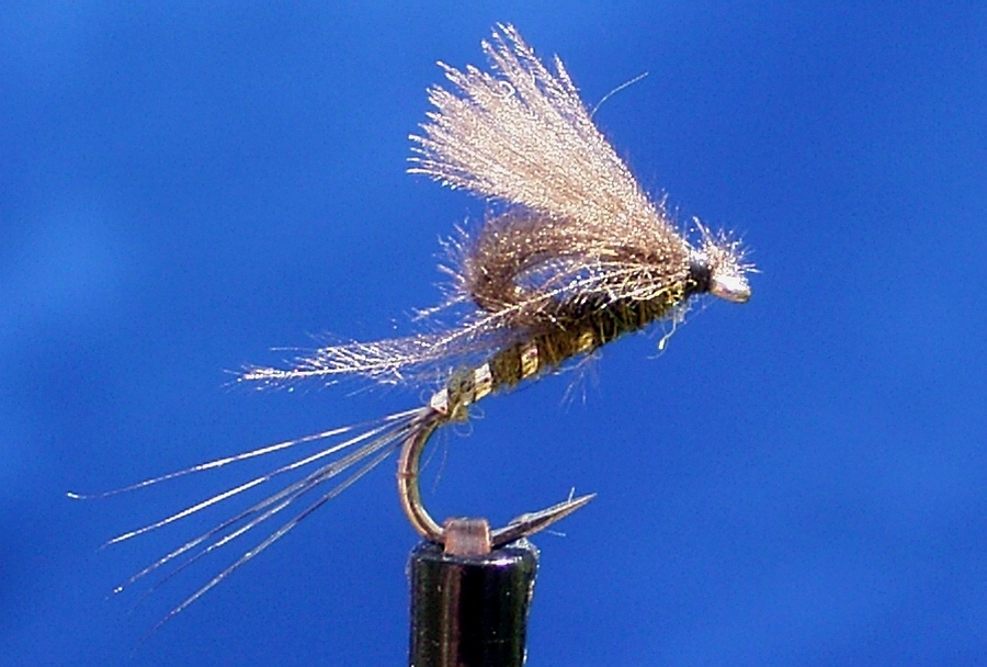 Haken: Kamasan B100 bronze #10 Körper: Peccary olive Flügel: 2 CDC natur, Rehhaar olive Thorax: Squirrel Dubbing olive Hechel: Rebhuhn Bindenanleitung: |