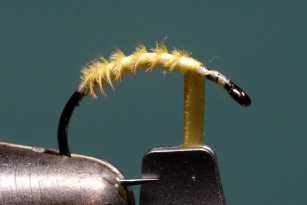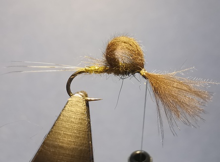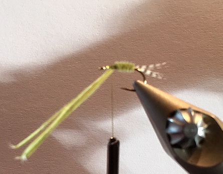2 CDC Federn mit den Spitzen zum Hakenbogen einbinden. Mit dem Dubbing den Thorax formen |