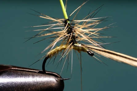 Haken: Gamakatsu F22 # 14 Bindefaden: Ultra Thread 70 olive Körper: Quill aus dem Pfauenauge, gefärbt olive (Parachuter77) Flügel: Klippspringer 1. Hechel: American genetic dry fly sadddle grizzly olive 2. Hechel: Partridge dyed yellow Bindeanleitung: |