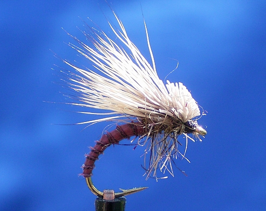 Köpfchen mit einem Tropfen Lack sichern. Viel Spaß beim Nachbinden! Die Fliege kann in Größe 10 bis 18 gebunden und gefischt werden. |