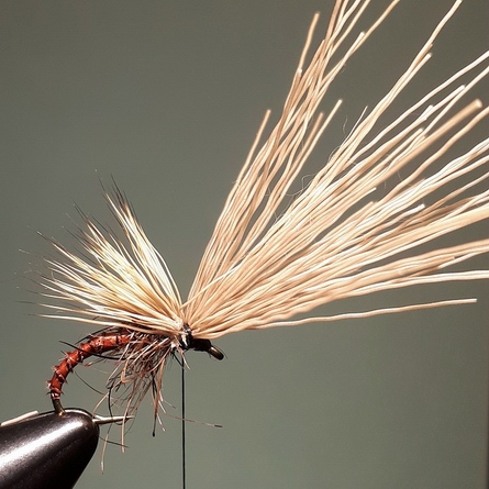 Haken: TMC 2487 Bindefaden: Veevus 10/0 schwarz Körper: brauner Biot Streifen Thorax: SWISS CDC Arctic Fur Dubbing Dark Brown Flügel: cremefarbenes Rehhaar Bindeanleitung: |