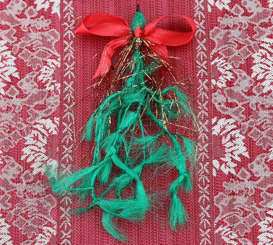 Den 5. Platz belegt mit nur 1 Stimme hinter 4.) die: Christbaumnymphe von Emmo Er schreibt dazu: "Der Köder muss dem Fisch schmecken, nicht dem Angler ... Was Herr Müller-Lüdenscheid heute wohl fängt? Zum Beginn der Adventszeit fertigte er aus dem Bastelfundus seiner Berta eine saisonal angemessene Nymphe, um die sich an Lebkuchen und Zimststernen vollgefressenen Fische anzulocken. Da musste es schon etwas Besonderes sein. Nach kurzer Überlegung stand die Idee zur Christbaumnymphe, inklusive Baumspitze und Lamettastrang. Sie sieht nicht nur gut aus, sondern sollte auch tatsächlich etwas fangen. Wenn schon keinen Flossenträger, dann soll sie doch wenigstens das Interesse anderer kälteliebenden Spezies wecken. Seiner Berta würde es auf jeden Fall gefallen, auch mal ein alternatives Mitbringsel vom Fischwasser zu erblicken. Abseits aller Geschichtenerzählerei hier mein Beitrag zum Bindewettbewerb. Mein Können ist noch sehr begrenzt, doch wollte ich mich der Herausforderung einer weihnachtlich gestalteten Fliege gerne stellen. Da ich u.a. Goldkopfnymphen übe, wollte ich einen stilisierten Baumstumpf und die Silhouette eines geschmückten Weihnachtsbaums mit Lametta und Spitzenkugel nachbilden. Ich glaube, dass dieses Modell am richtigen Tag am richtigen Wasser durchaus Chancen auf einen Fangerfolg hätte – was denkt ihr? Emmo" Maßangaben: Nymphe