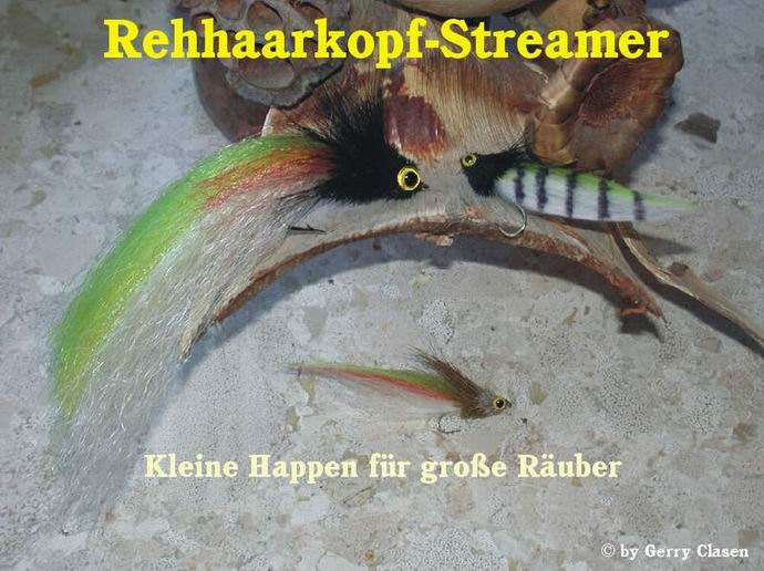 Diese Art von Streamer binde ich ja schon einige Zeit und bin mit den Ergebnissen auch sehr zufrieden, erbrachte mir eines der großen Muster in meinem letzten Schwedenurlaub doch einen Hecht mit 106 cm und 16 Pfund. Nur der Kopf meiner Streamer hat mir nie so 100-prozentig gefallen. Die Rehhaarköpfe waren mir natürlich bekannt, nur hatte ich sie, warum auch immer, als sehr aufwendig zu binden in Erinnerung. Allein der Gedanke an die „Zurechtschnippselei“ der Haare hat mich meistens davon abgehalten diese Bindeweise zu wählen, bis, ja, bis mir DIE Idee gekommen ist. Aber dazu später. |