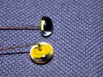 | Bekannterweise sind Augen beim Streamer Schlüsselreize, die gerne angenommen werden. Der Draht wird mit einer Zange in die gewünschte Form gebracht. Der Augenhintergrund wird gelb lackiert, so kommen sie besser zur Geltung. | Der Draht