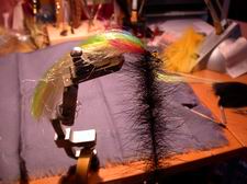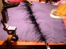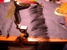 Jetzt kommt die Hauptsache, das Köpfchen. Wir nehmen ein Stück Rehfell (hier schwarz), übergeben ein gutes Büschel in den Klemmhalter und schneiden es möglichst lang ab. |