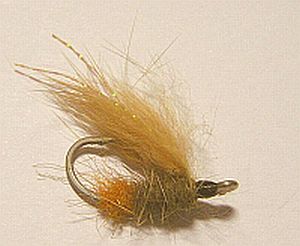 Hakengröße: 4 – 8 | Bindefaden: gelb Augen: kleine Kettchenaugen Körper: keiner. Schwinge: weißes Kaninchenhaar Kopf: orange Chenille Eine Fliege, die aufgrund ihres Aufbaus ebenfalls ohne Scheuchwirkung im Flachwasser angeboten werden kann. Sehr gut auch in tan. |