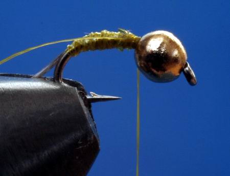 Kopfperle: 2mm Tungsten Dubing: Hends Czech Nymph Dubbing Haken: Scudhaken gebogen Größe 20 Schwänzchen: 3-4 Fibern einer Entendeckfeder Wir spannen