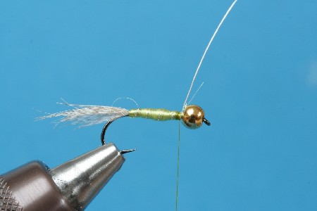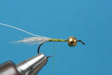 - Nymphenhaken für Goldköpfe (etwas verlängert) Gr.10 - eine Goldkopfperle aus Messing oder Wolfram - Bindefaden Stärke 8/0 – helloliv - Silberdraht ca. 0,2 mm - eine Entendeckfeder für den Schwanz - grobes Dubbing, hier Fuchs - Acetat-Floss in Helloliv für den Körper und in Schwarz für die Flügelscheide <= Montieren Sie den Goldkopf