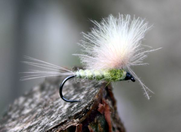 | Bindeanleitung: Grundwicklung machen, danach ein paar Hahnenhechelfibern als Schwänzchen und den Rippungsfaden einbinden. Als nächstes den Körper dubben und rippen. Als Sichthilfe wird eine CDC Feder an der Spitze mit zwei Umdrehungen des Bindefadens befestigt. Danach wird die Feder an der Spitze weiter herausgezogen, sodass mehr Fibern durch den Bindefaden gehalten werden. Nun fixiert man diese und schneidet die überstehenden Federkiele ab. Jetzt werden eine oder zwei CDC Federn in der Schlaufentechnik verarbeitet und wie bei einer normalen Parachute-Fliege um die Sichthilfe aus gelbem CDC gewunden und danach fixiert. Nun wird der Thorax noch mit Dubbing geformt und die Fliege mit ein paar Kopfknoten abgeschlossen. |