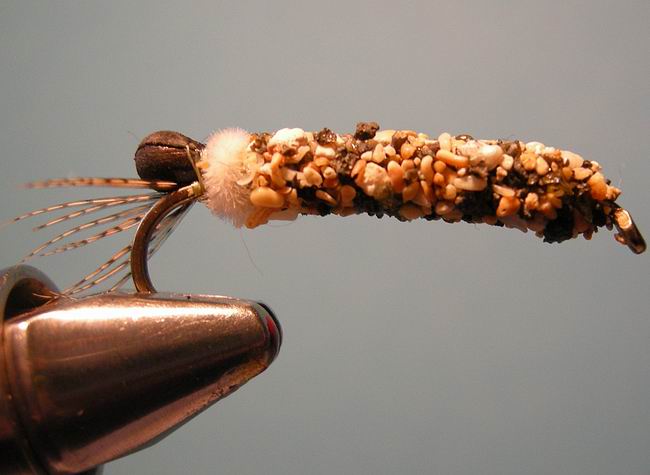 | Dann noch etwas lockeres Dubbing als Beinchenimitation unter dem Thorax des Nymphenkörpers aufbringen und den Nymphenkörper vorne mit Hilfe des kleinen Überstandes festbinden. | ![]() |