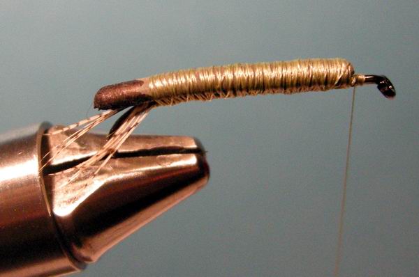 oben auf den Hakenschenkel legen und mit dem Kupferdraht bis zum Thorax
