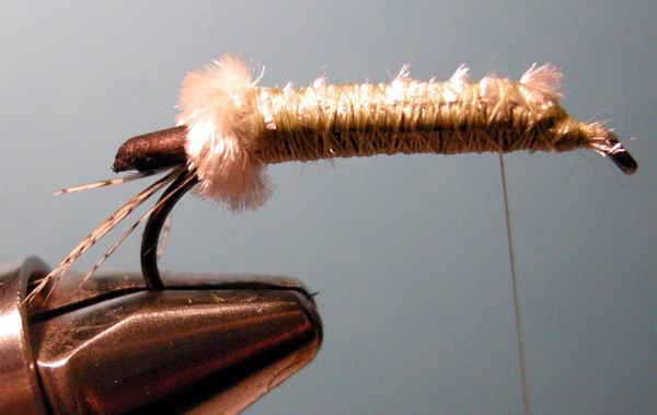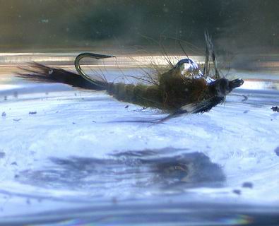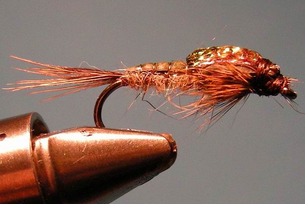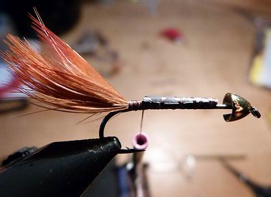 Das ist ein einfaches Muster, welches ich eigentlich immer mit Bleiband binde. Der Haken ist der gleiche wie bei der Stoneflynymphe. Einfach mit der Grundwicklung anfangen, danach die Strange so zurechtschneiden, das ein langer unten eingebunden wird und ein kleines Stück oben auf den Haken. Dadurch bekommt man die gewünschte Form und sie schwimmt in der richtigen Lage im Wasser. Danach eine kleine Dubbingkugel hinten einbinden und die Biots von der Gans links und rechts einbinden. Nun einfach mit dem Dubbing den Unterkörper formen und mit dem Draht rippen. Etwas andersfarbiges Dubbing für den Vorderkörper verwenden. Einen Teil davon aufspinnen und danach eine Wicklung machen. Nun bindet man als Flügelansatz eine Perlhuhnfeder ein, wieder eine Wicklung mit dem Dubbing machen und noch |