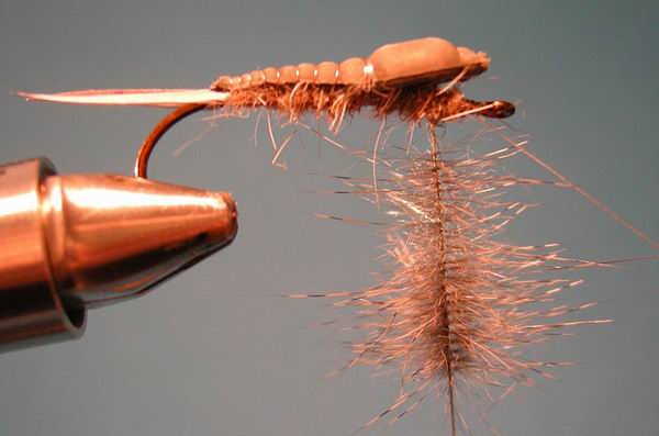 Die Grundwicklung auf dem Haken aufbringen und vorne beim Öhr ein Bündel Hahnenfibern einbinden. Dazu den Rippungsdraht vorne einbinden. Jetzt den Faden nach hinten führen und die Thin Skin einbinden, dann den Gammaruspanzer anbringen und mit dem Bindefaden fixieren. Nun das Dubbing von vorne nach hinten wickeln, die Thin Skin nach vorne klappen und mit dem Draht rippen. Nun die Thin Skin nochmals nach hinten klappen, mit dem Faden sichern und als Fluke abschneiden. |