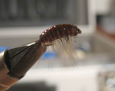 Grundwicklung aufbringen, Rippungsdraht einbinden, dann eine Hechelfeder im Palmerstil einbinden und sichern. Nun den Gammaruspanzer lackieren und danach einfärben. Den Panzer mit dem Rippungsdraht auf dem Haken fixieren. Whip finishen und nochmals lackieren, fertig. |