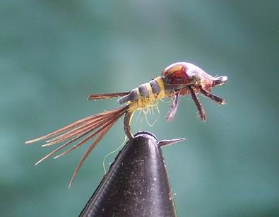 Eines vorweg: Wie oben gesagt habe ich hier Foam benutzt, damit hat das Muster Auftrieb wie ein Korken. In Verbindung mit dem Schwanz ein Never sink Muster. Zuerst wird die Grundwicklung auf einen Haken der Größe 10 (TMC 100) aufgebracht. Danach den Stonefly Schwanz einbinden und mit wenig Superkleber gegen das Verrutschen sichern. Nun habe ich ein 4 mm breites Stück Foam nach hinten stehend eingebunden und die Beine. Mit Dubbing und Kreuzwicklungen den Grundbody geformt. Dann als Rückenpanzer das Foam nach vorne geklappt und abgebunden, wieder etwas Dubbing und die Buckel damit geformt. Das Foam wieder darüber geklappt, die Flügel ausgetanzt und eingebunden. Das nach vorne überstehende Foam einbinden. Mit Dubbing den Kopf geformt und das Foam darüber nach hinten geklappt und gesichert. |