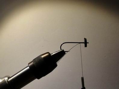 1.: Taumelscheibe auf Haken ziehen, Haken einspannen und Grundwicklung legen. Dabei etwas mehr hinter der Taumelscheibe auftragen, sodass diese durch den Bindefaden fixiert ist. 2.: Pinkes Marabou als Schwänzchen einbinden und Dubbingschlaufe legen. Via Hechelklemme, einige Marabou hecheln in pink in die Schlaufe legen und verdrallen. 3.: Den Körper mit den Hecheln formen und ca 2 mm vor der Taumelscheibe abbinden, mit halbem Schlag sichern. 4.: Zum Schluss noch eine Marabou-