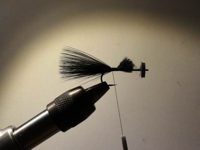1.: Conehead auf Haken ziehen, Haken einspannen und Grundwicklung legen. Conehead mit Bindefaden fixieren, sodass er nicht nach hinten durchrutschen kann. 2.: Schwänzchen einbinden und Chenille festlegen. Mit dem Chenille den Körper nach vorne Winden und ca 2mm vor dem Conehead Platz lassen. Chenille mit halbem Schlag sichern. 3.: Perlhuhn Hechel als Kopfhechel einbinden und mit Kopfknoten und Bindelack abschließen. Conehead-Spider Haken: Streamerhaken 2x lang Gr.