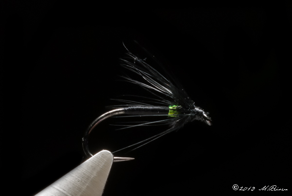 gebunden von Dirk Material: Faden: UTC 140 und Uni 8/0 in Schwarz, Spot: Uni Floss Chartreuse, Thorax: 2 Windungen mit einer Straußenfiber, Kopfhechel: Henne schwarz Bindeanleitung: Schwarzen UTC 140 etwas weiter hinten ansetzen und einen kurzen schwarzen Körper formen. Abschlussknoten machen und Körper lackieren. Nach dem Trocknen das Unifloss aufdröseln und nur einen der beiden Stränge verwenden. Uni 8/0 Faden ansetzen und mit dem Floss den Spot formen. Dann folgen 2 Windungen mit einer Straußenfiber und anschließend die Kopfhechel, die man auf einer Seite haarfrei macht. *** |