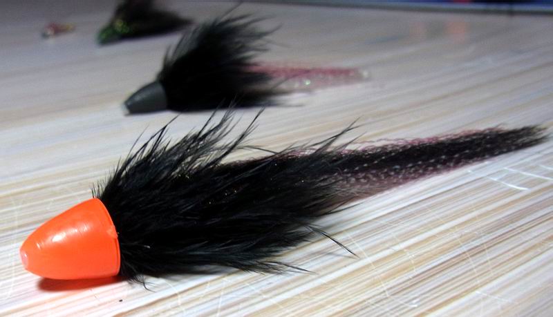 1. Kleine Tube auf Tubennadel schieben und Grundwicklung legen, sodass vorne die Wicklung etwa 5mm vor dem vorderem Ende der Tube aufhört (der Platz wird später für den Conehead gebraucht). 2. Die Tube von hinten bis zur Hälfte schwarz dubben. 3. Einen Strang schwarze Frizz Fibre oben auf die Tube binden, sodass die Hälfte des Strangs nach vorne und die Hälfte nach hinten zeigt. 4. Fibre umklappen und Niederbinden. 5. Ein paar pinke Cristalflashfäden rechts und links von der Frizz Fibre einbinden. 6. Dubbingschlaufe legen und schwarzes Marabou in dieser verarbeiten. 7. Mit dem Marabou Kragen formen und Abschlussknoten machen. 8. Den Knoten mit etwas Lack überziehen. 9. Den orangen Conehead von vorne über die Tube schieben. Falls tiefer gefischt werden soll, kann die Tube auch noch eine Bleiwickung unter dem Dubbing bekommen, oder man verwendet einen Tungsten Conehead." *** |