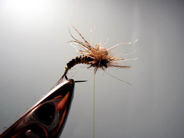 Durch die Styroporkugel und den Dubbingmix hängt dieser Emerger schön im Wasserfilm. Noch ein Tipp: sollte die Styrokugel nach etlichen Bissen verloren gehen, kann man dieses Muster auch als Nymphe fischen.... Viel Spaß beim Nachbinden und Fischen wünscht Peter *** |
