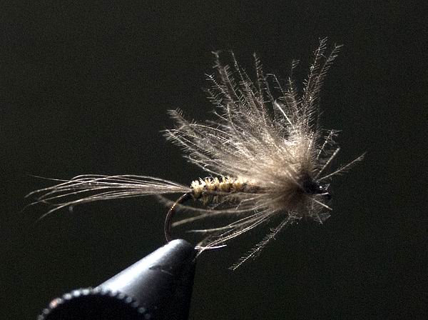- Mit dem Bindefaden eine Grundwicklung von der Hakenmitte beginnend bis zum Ende der Fliege anlegen. - Am Ende der Fliege drei Fibern Fasanenstoß zusammen mit einigen Fibern Antron einbinden. - Das Schwänzchen sichern und den Faden bis zur Hakenmitte zurückführen. - Den übrigen Teil der Fasanenfibern in dichten Windungen zur Hakenmitte führen, um den Hinterkörper der Fliege zu bilden. Dort abbinden und mit einigen Fadenwindungen sichern - den überschüssigen Rest abschneiden. - Mit dem Bindefaden auf diesem Punkt eine Schlaufe für den Paraloop anlegen - etwa 2 cm sind dabei ausreichend. - Eine einzelne Fiber der Straußenfeder einseitig vom feinen Flaum befreien – im Bereich der Einbindebasis erfolgt dies beidseitig. - Den Paraloop bilden - dabei legen wir die Fiber in einigen offenen Windungen um die Fadenschlaufe herum nach oben. Nun in wenigen Windungen zurück zur Einbindebasis der Fiber auf der Hakenmitte. - Nun an diesem Punkt beidseitig und gleichmäßig die Hechelfibern einbinden und sichern. - An gleicher Stelle 2 - 3 Fibern Pfauengras einbinden - den Faden in Richtung Hakenöhr winden und ablegen. - Das Pfauengras in einigen engen Windungen in Richtung Hakenöhr führen um so den Vorderkörper zu bilden. Hinter dem Öhr abbinden & abschneiden. - Den Paraloop in Richtung Hakenöhr über Pfauengras führen, mir einer Windung abfangen, etwas in Form ziehen, abbinden und sichern. - Zum Abschluss der Fliege mit einigen Fadenwindungen das Köpfchen formen, einen Kopfknoten setzen und mit einem Tropfen Lack sichern. Viel Spaß beim Nachbinden & Petri Heil, Dyrk *** |