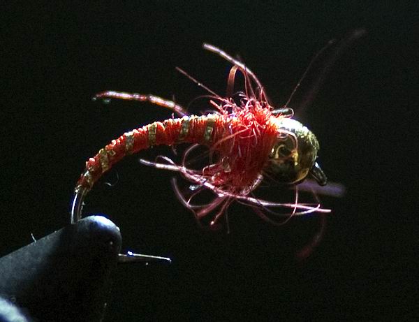 Der Witz an dieser Nymphe und natürlich bei allen anderen Nymphen dieser Art auch ist: ich binde keine Perle ein. Die Perle auf das Vorfach auffädeln und dann die Nymphe anknoten geht genauso. So kann ich ein und die selbe Nymphe unbeschwert, mit bunter Plastikperle oder beschwert mit Kupfer-, Messing-, oder Tungstenperle verwenden. |