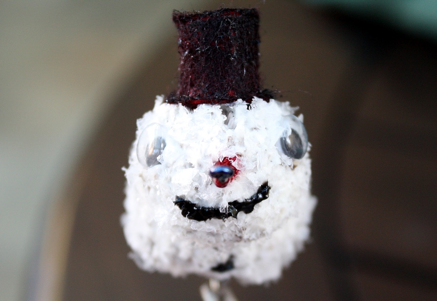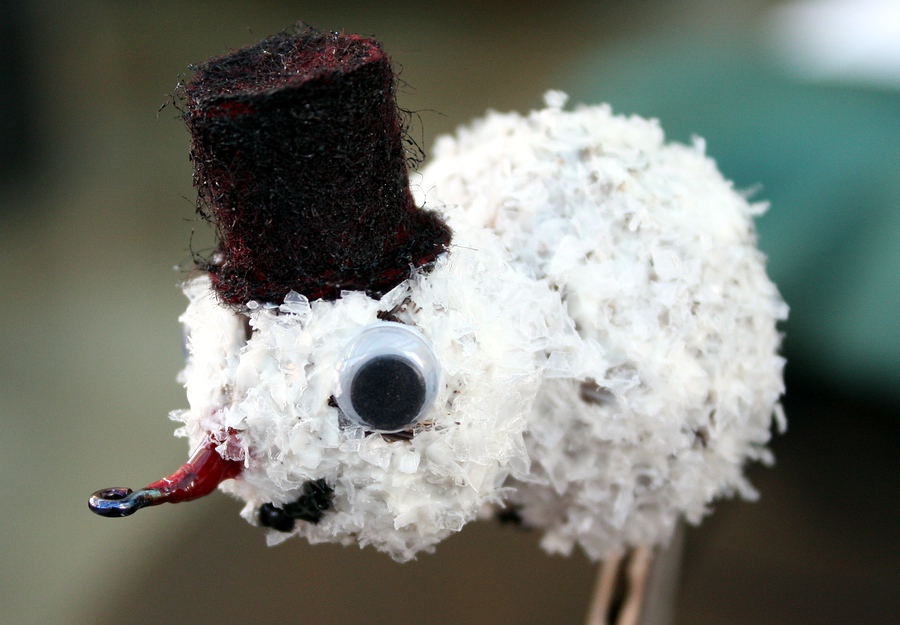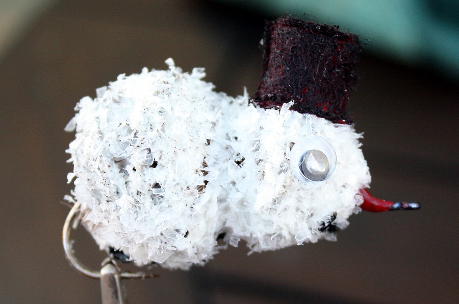 6 cm lang, wurde das plüschige Kerlchen wie folgt gebunden: "...4/0 Haken, der Körper besteht aus Rehhaar und Kunstschnee (auf den kompl. Haken Rehhaar einbinden und in Form schneiden, dann den Körper mit weißer Windowcolor Frabe überziehen und mit Kunstschnee überziehen). Der Hut ist aus Filz zusammen geklebt." |