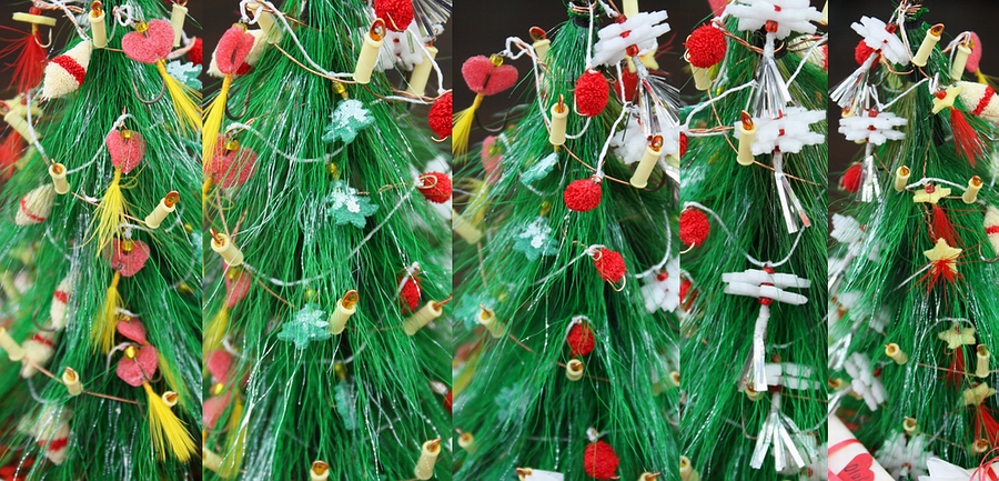 Christbaum- von Regine Maguhna Herzlichen Glückwunsch! Diese unglaublich aufwändige Weihnachtsfliege legte die Latte von Anfang an sehr, sehr hoch... Der 23 cm hohe Christbaum besticht als Gesamtkunstwerk, aber vor allem durch seinen Baumschmuck, der aus 35 (!) einzeln gebundenen Fliegen besteht! Zum Aufbau: 2 x 3 große Haken wurden als Stamm des Baumes zusammen gebunden. Die Lichterkette besteht aus Draht und Q-Tip, die Flammen wurden mit Windows Color coloriert. Das Tannengrün ist aus Bucktail, leicht mit weißer Farbe coloriert. Die Tannenbaumspitze ist Q-Tip, mit Rehhaar bestückt, für den Stern wurden Perlen auf Draht verwendet. Der Weihnachts- baumschmuck, bestehend aus 35 Einzelfliegen in 6 verschiedenen Musterserien, wurde wie folgt gebunden: Muster 1: rotes Rehhaar, Muster 2: rotes und weißes Rehhaar, Muster 3: rote Perle, Schneeflocke aus Foam, rote Perle, weitere Schneeflocke aus Foam, rote Perle, Lametta Silber, Muster 4: gelbe Perle, Tannenbaum aus Foam, mit weißem Lack-Schnee dargestellt Muster 5: rote Perle, gelber Stern aus Foam, rote Perle, rotes Marabou und Muster 6: rotes Herz aus Foam, gelbes Marabou Als Weihnachtstisch dient ein mit rotem Glitterpapier beklebter Karton, als Geschenke liegen 5 kleine Kartons, schick eingepackt, mit Schleife und Namensschildern versehen auf dem Tisch, an dem zudem ein Schild „Frohe Weihnachten“ hängt, aus grünem Karton, mit 4 ausgestanzten Weihnachtsbäumen und mit Goldstift beschriftet. |