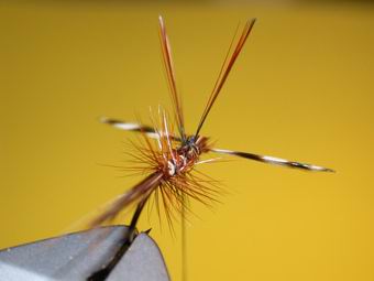 | Durch Kreuzwicklung werden die Flügel in Stellung gebracht. So sollten nun die "Spent-Flügel" abstehen. | Das gleiche machen wir jetzt mit den braunen aufrechtstehenden Hechelspitzen. Mit dem Bindefaden werden ein paar Wicklungen vor den Hechelspitzen gelegt, sodass sie sich besser aufrichten. |
